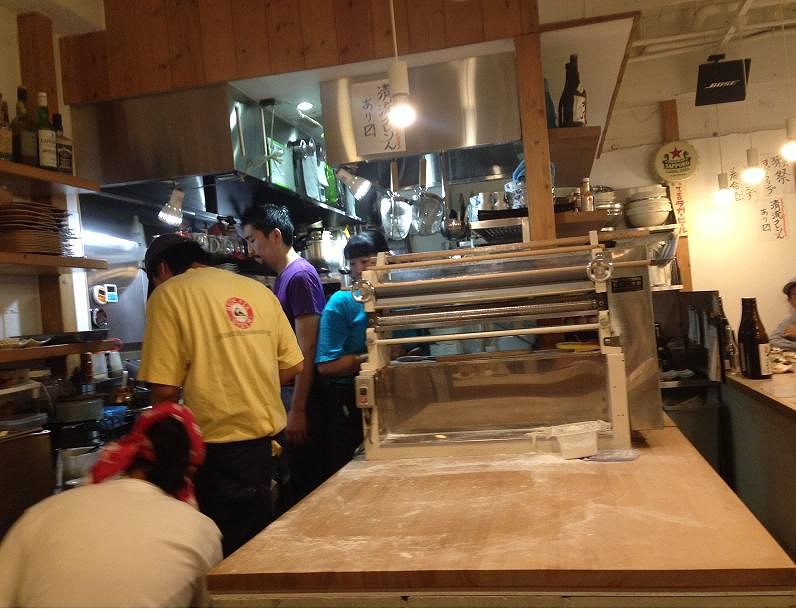 目の前の台で、お店の人がうどんを手打ちで作っています♪