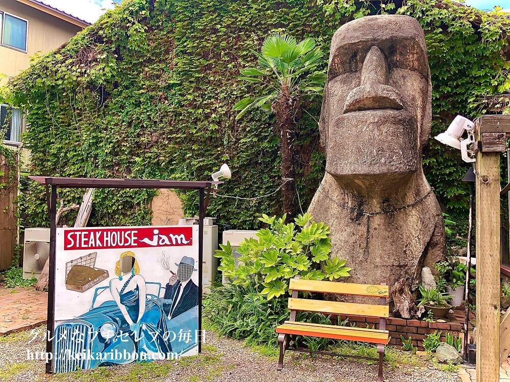 「STEAKHOUSE jam」の看板の男女の顔が穴になっています。