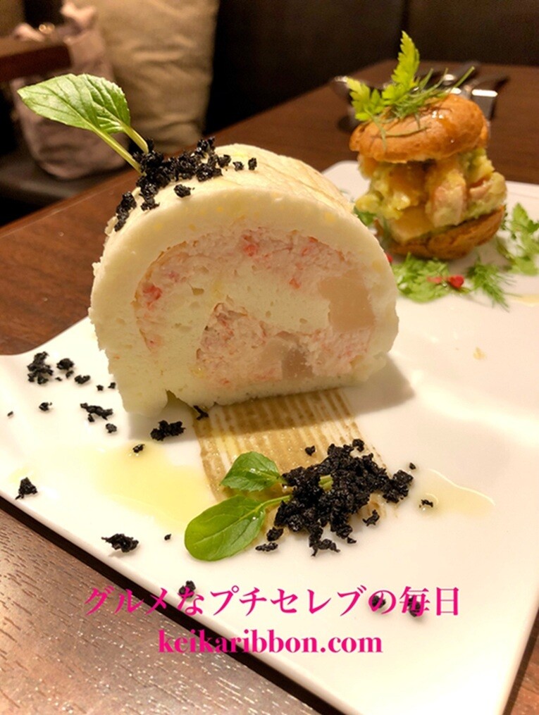 カニのロールケーキとサーモンアボカドのミルフィーユ